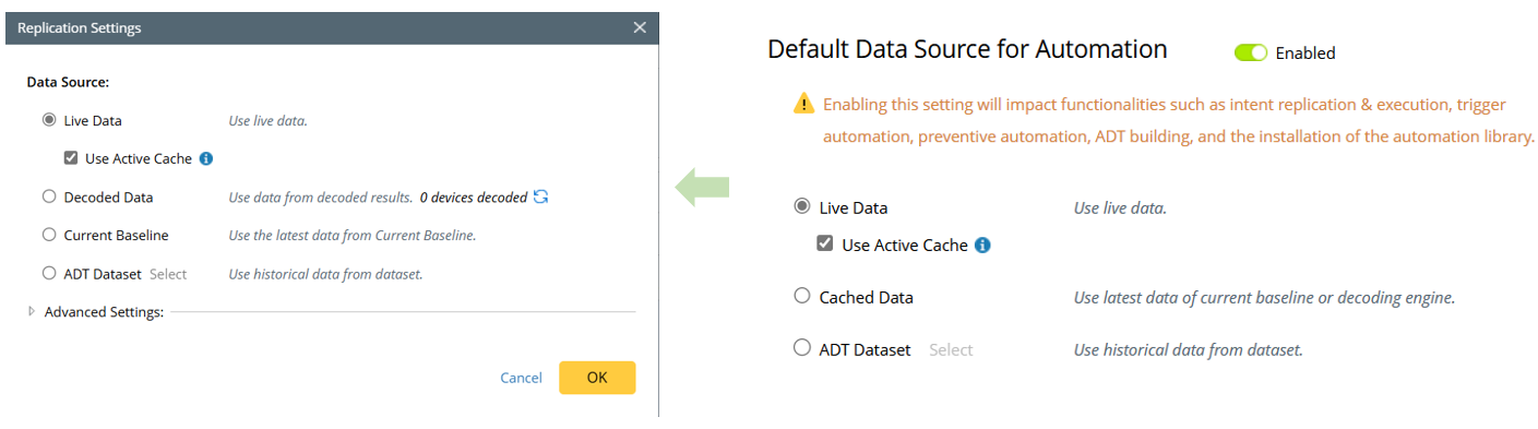 Information Note: The Current Baseline option in Replication Settings corresponds to the Cached Data option in the domain-level default data source settings; Auto option corresponds to Live Data in domain-level default data source settings; Use config file from current baseline checkbox option corresponds to the Use Active Cache option in domain-level default data source settings.