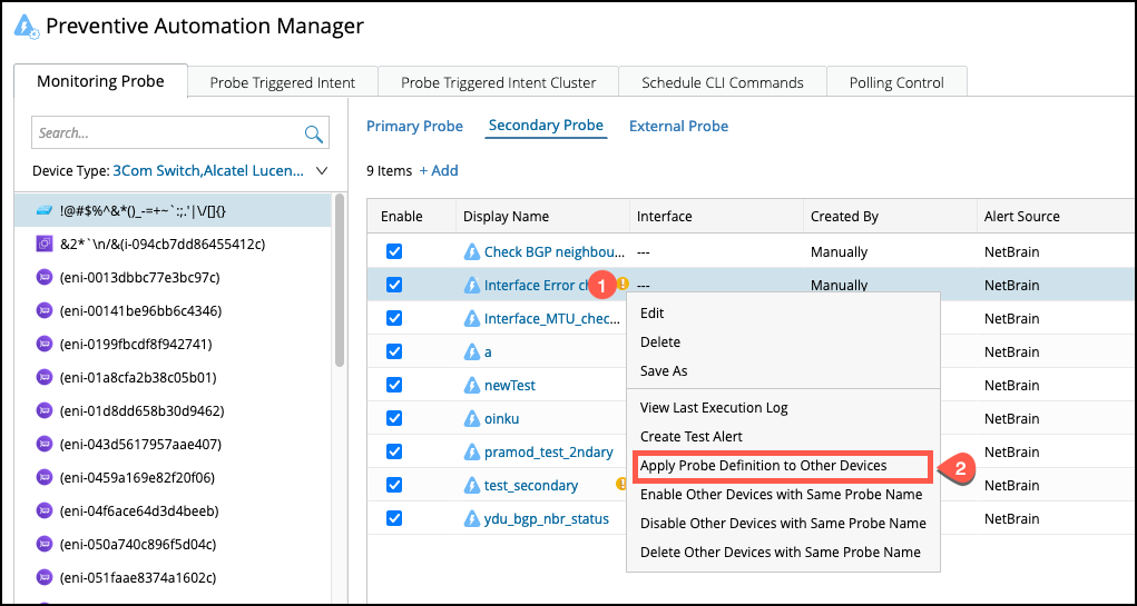 Note: If there is no primary probe available in the target device, a primary probe will be generated first and it will trigger secondary probe. And the probe names will be same on target and source devices.