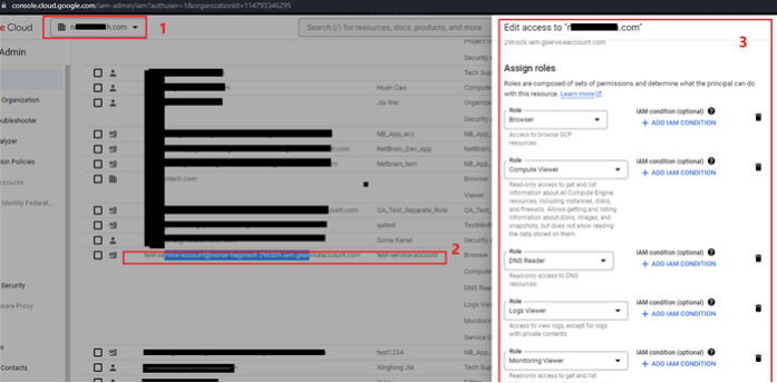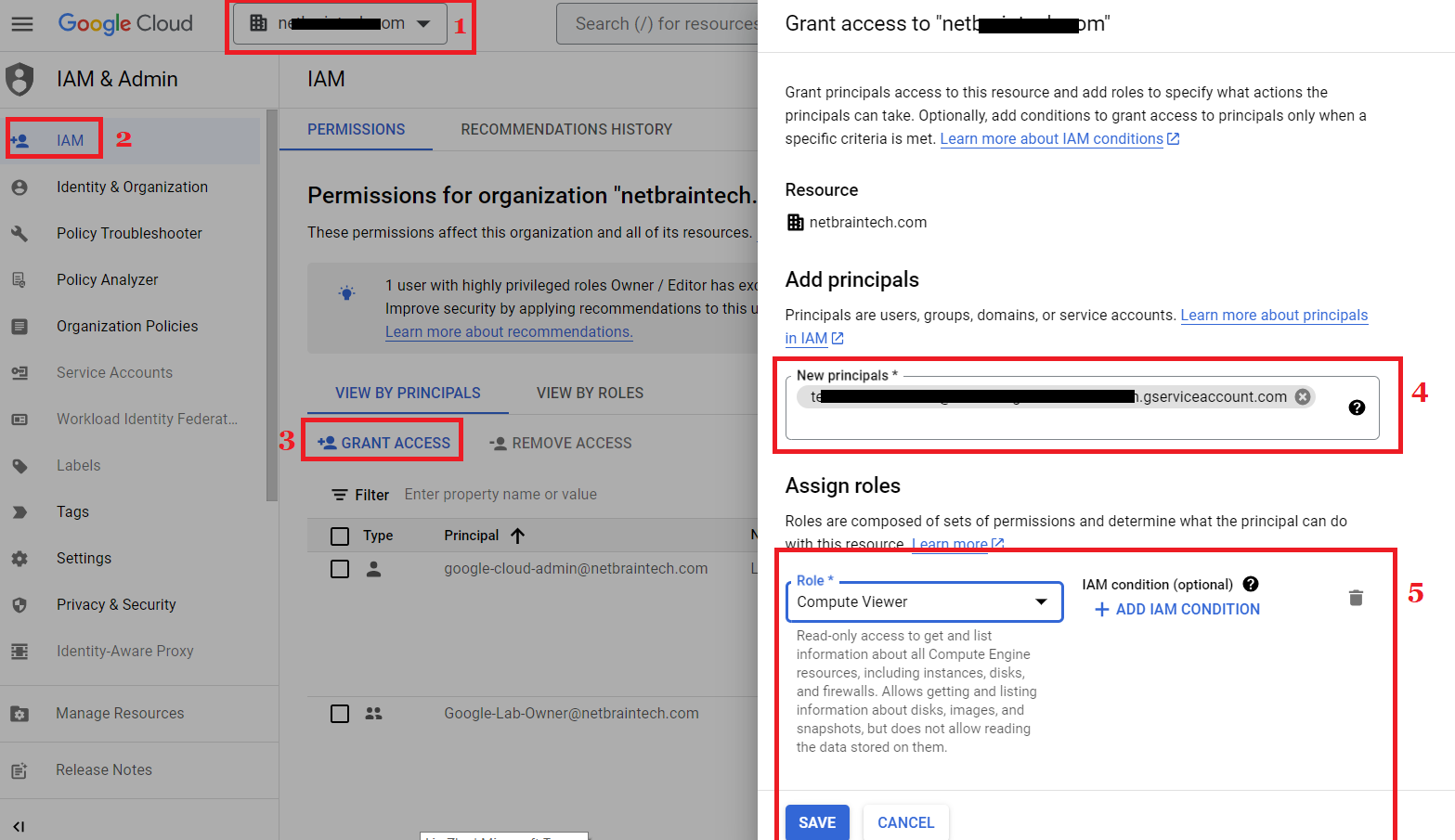 - Go to IAM & Admin > IAM, select the GCP Organization or Project from the top drop-down menu, and then click GRANT ACCESS.