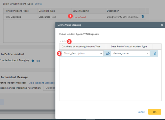 Define the value mapping, which matches the data fields in the incoming incident type to the data fields in the virtual incident type.