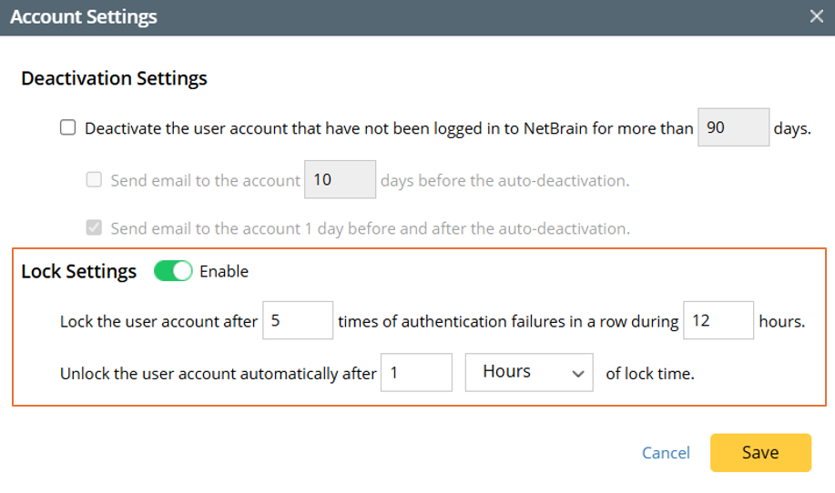 - In the Lock Settings section of the pop-up Account Settings dialog, turn on Enable to enable locking/unlocking user account.