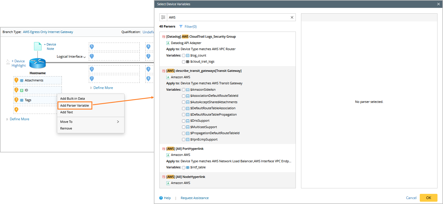 To retrieve more types of data from AWS (for example, live CloudWatch data), you need to use the API parser to retrieve the data from AWS and then select respective Parser Variables. As the API parser data can be retrieved from your live network with a frequency, you can use this method to build your Data View Template if you need to pull the data from your live network.