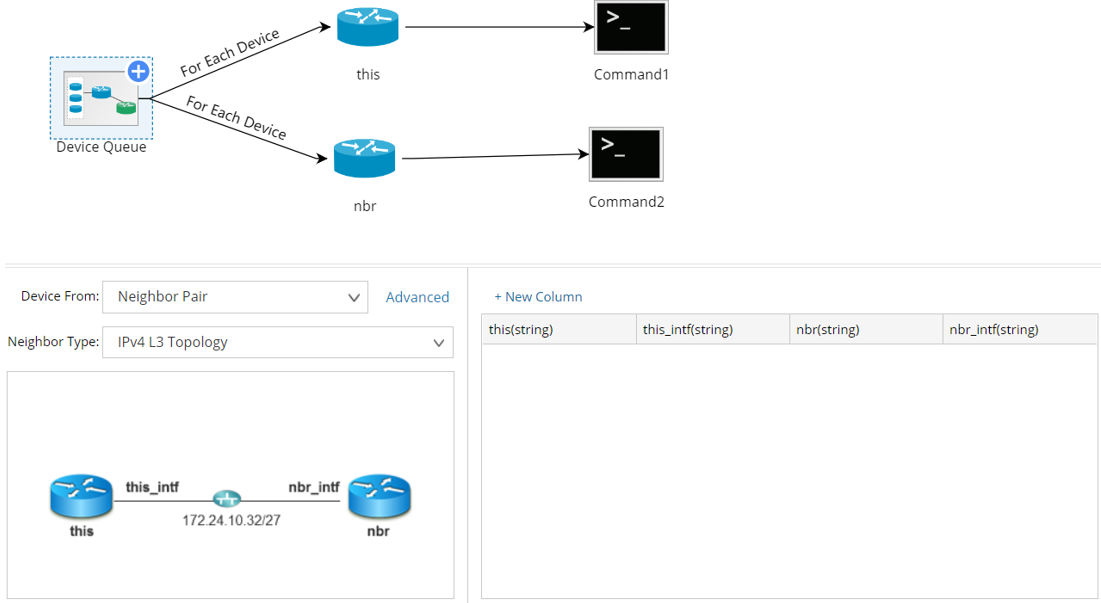 To analyze and compare the parameters between two connected devices, you need to set the Device Queue to build devices in the Neighbor Pair pattern. In this pattern, Device Queue builds a device and one of its neighbors based on connected interfaces in the same one row. Thus, at runtime, the Qapp will read the device and its neighbor at one loop cycle to retrieve both MTU value of their connected interfaces for further analysis.