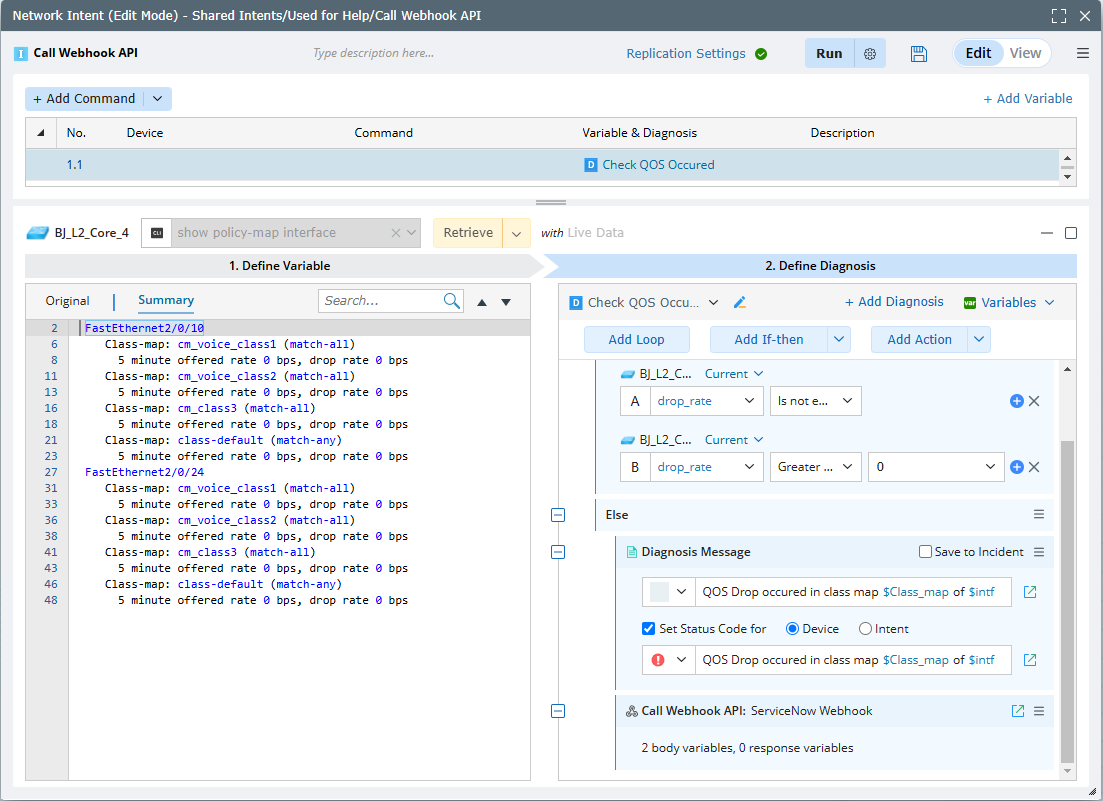 - Add the Webhook logic node to send the problematic device and incident ID back to ServiceNow.