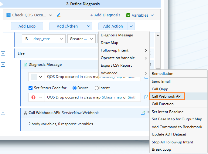You can navigate to Add Action > Advanced > Call Webhook API in NI diagnosis to add a Webhook API Call block.