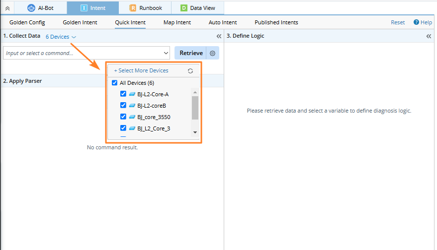 Open a map and navigate to the Quick Intent tab, and all the map devices are listed and selected by default.