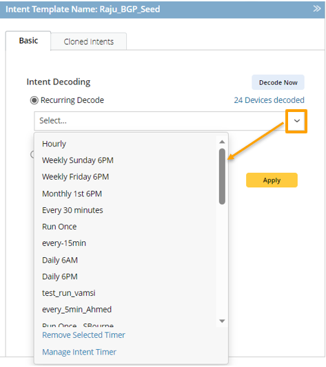 The Intent Timer is a setting to control the frequency of decoding baseline data of devices for an intent and the frequency of executing intent. You can configure when to update the baseline and execute the intent via Intent Timer.