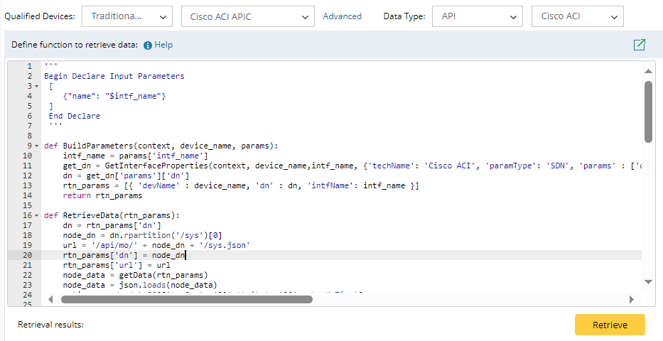 | 3 | def RetrieveData(devices) | This function is used to retrieve the data of devices based on the parameters declared in the Declare Parameters and BuildParameters functions. This function contains one parameter. The following is a sample code of this function: