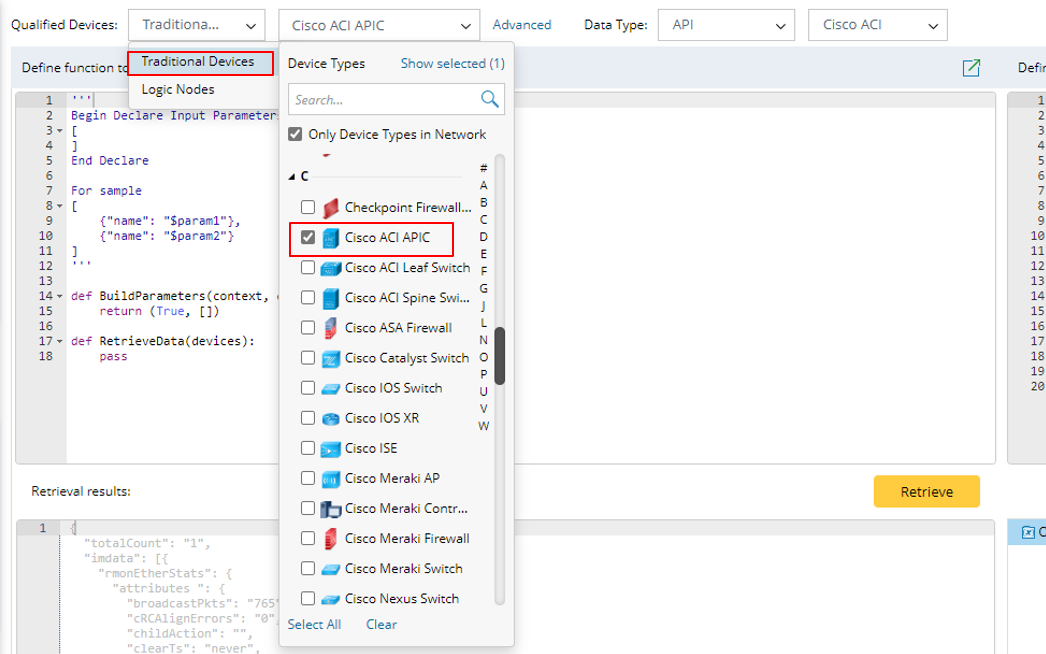 - Keep the default Traditional Devices option from the Qualified Device list, select Cisco ACI APIC from the second list.