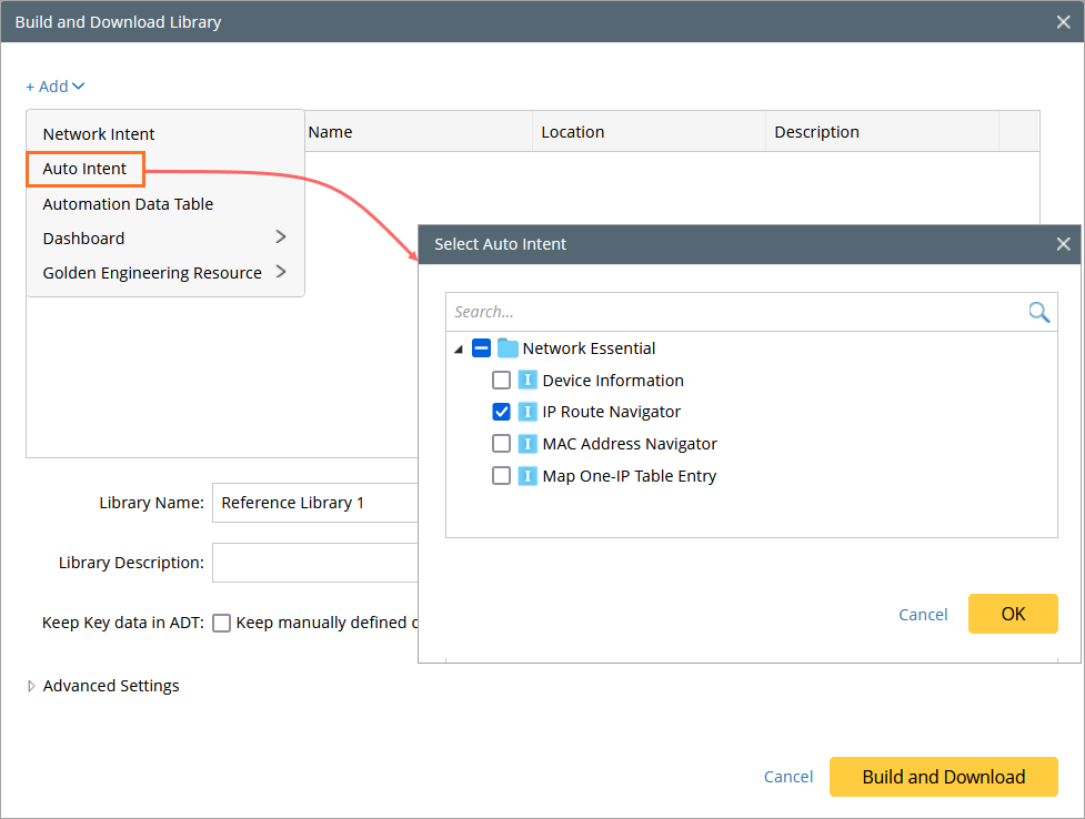 For example, Golden Config Templates in ADT will be exported as resource in Library when the Keep manually defined data in ADT checkbox is selected. In addition, the intents in the manually defined intent column will also be exported to the Library as related resources.