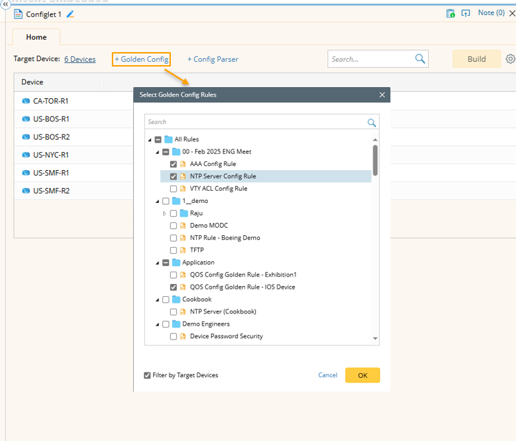 Note: In Select Golden Config Rules and Select Config Parser Variables dialog, the "Filter by Target Devices" checkbox is selected by default. This can be used to filter the golden config rules and config parser variables matched with the target device, narrowing the selection scope.