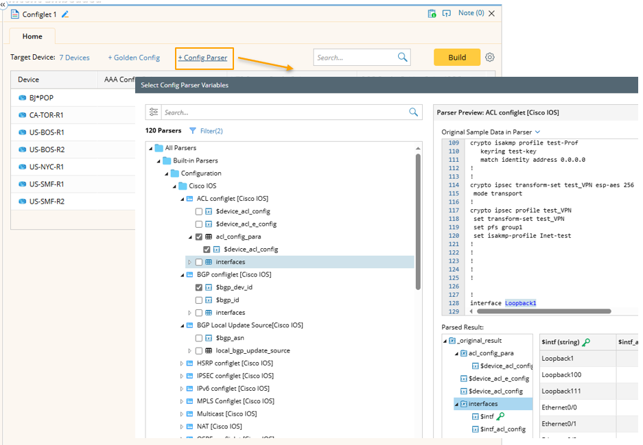 - Run config parser with the config file in current baseline to parse configlet.