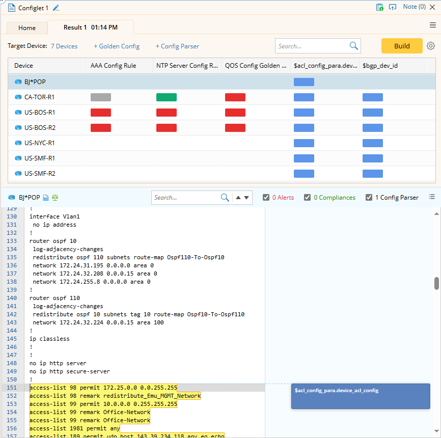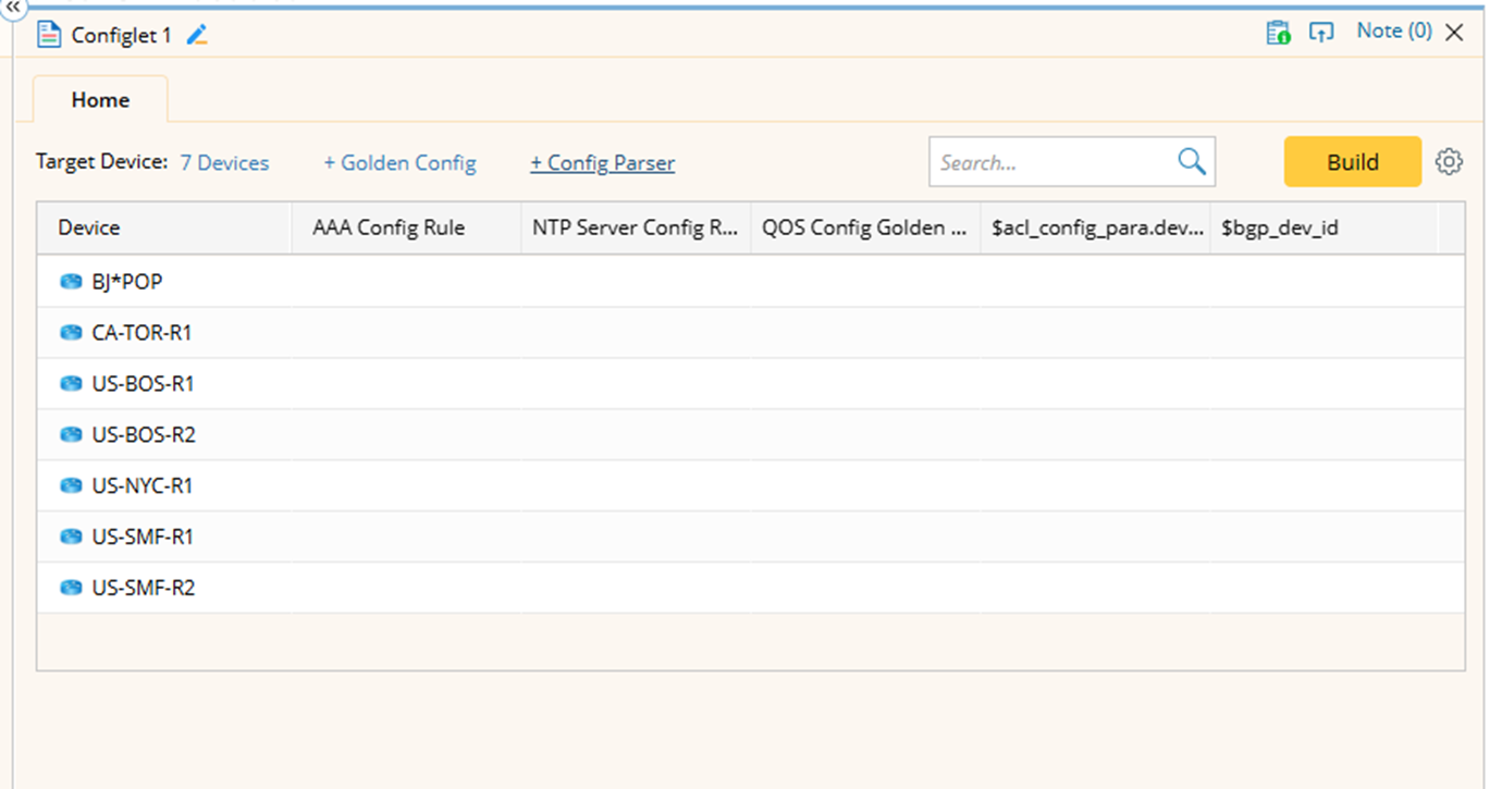 Note: The Device column is always fixed as the left-most column and cannot be removed. The Golden Config Rule column is named with the corresponding golden config rule name, while config parser variable columns are named using the format “ParserName.var”. - Click Build to get configlets for each target device using the config files from the current baseline. As the build progresses, color blocks will gradually appear in the table below to show the configlets.