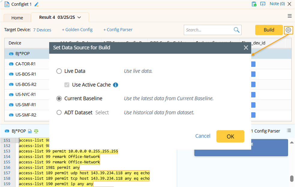 The data source for building configlet is configurable. The default data source is Current Baseline.