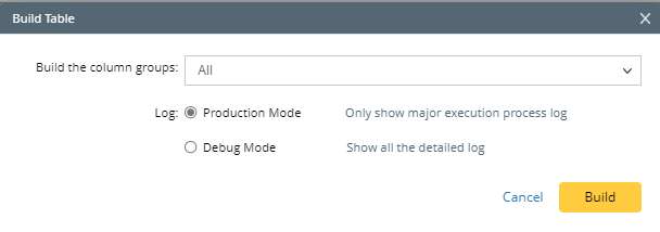 - In the Build Table dialog, select columns groups to be built and select a log mode. Click Build.