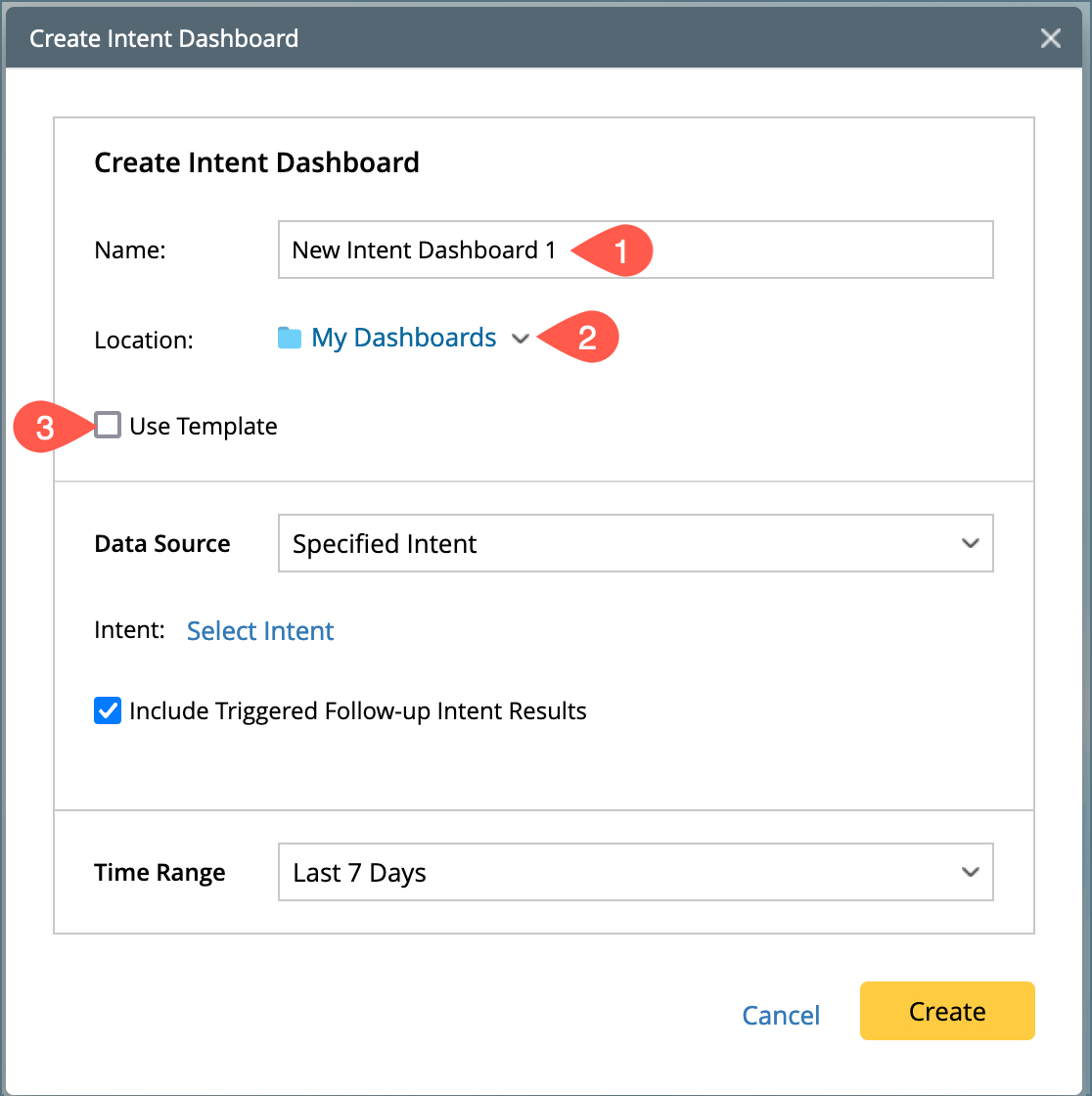 Optionally check-in Use Template to create a dashboard using a saved template. Refer to Create a Dashboard using Intent Template more details.
