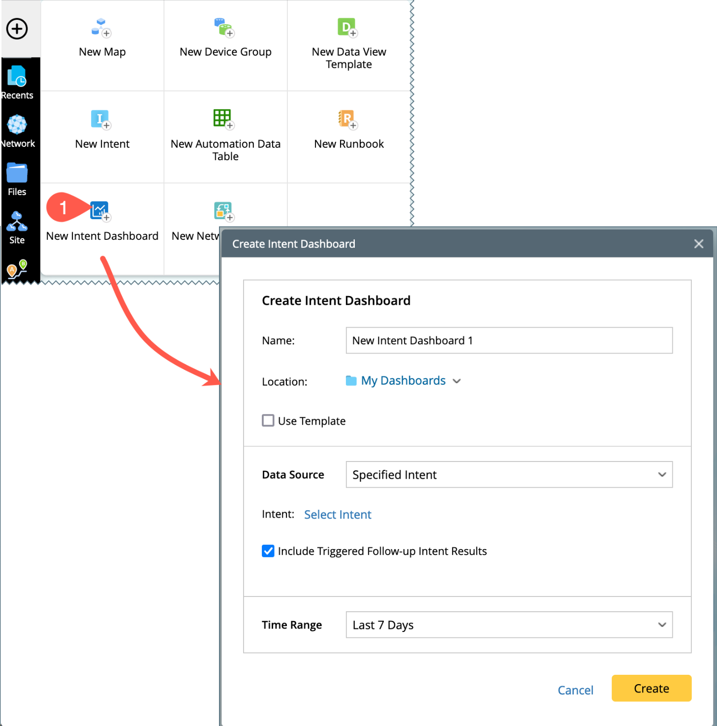 - Once you complete the configuration in the wizard, click Create to create the intent Dashboard.