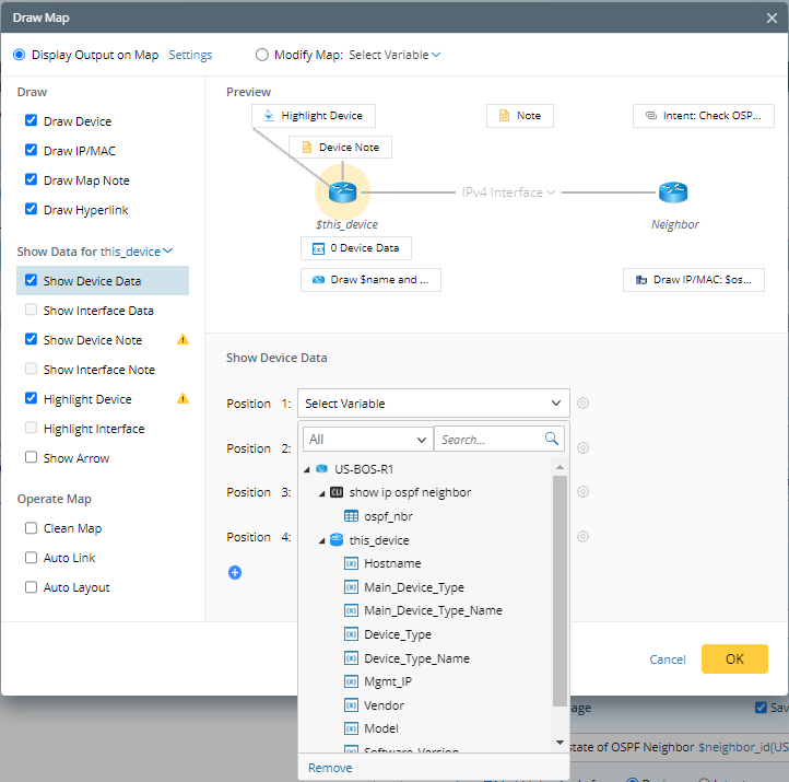 The Intent Data View is aimed to display the diagnosis data and results on an intent map or any map, so you can view the network design or monitor the network status on the map. When define the Intent Data View, you are allowed to select other device objects instead of $this_device only. You can select another relevant device of $this_device, e.g. LWAP device of the current WLC device, or a virtual device of the current physical device.