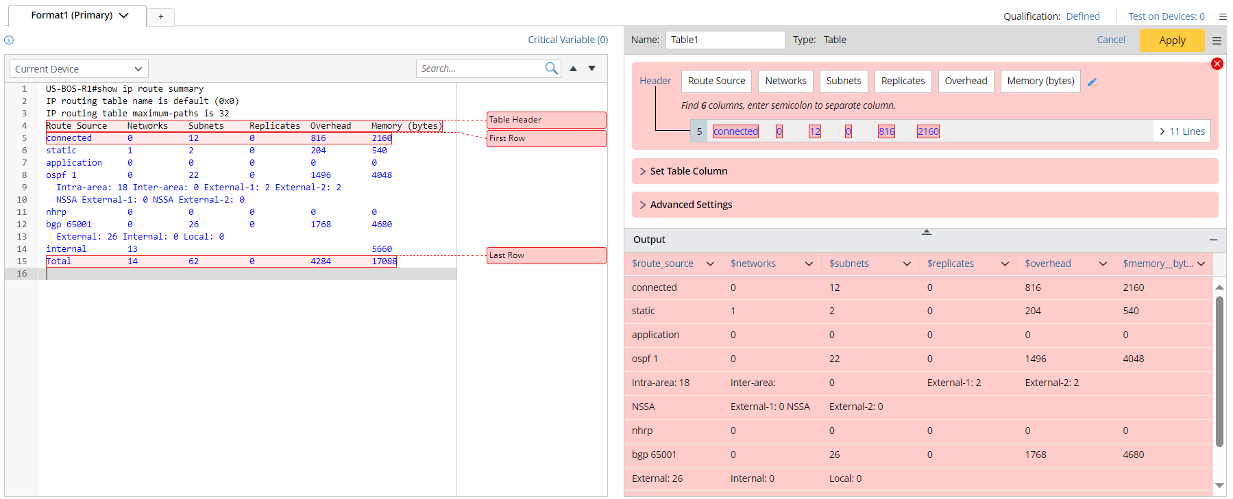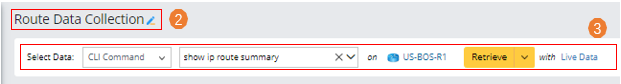 icon to specify the parser name. - In the Select Data area, define to retrieve the "show ip route summary" CLI command data on device US-BOS-R1 with Live data as the data source.