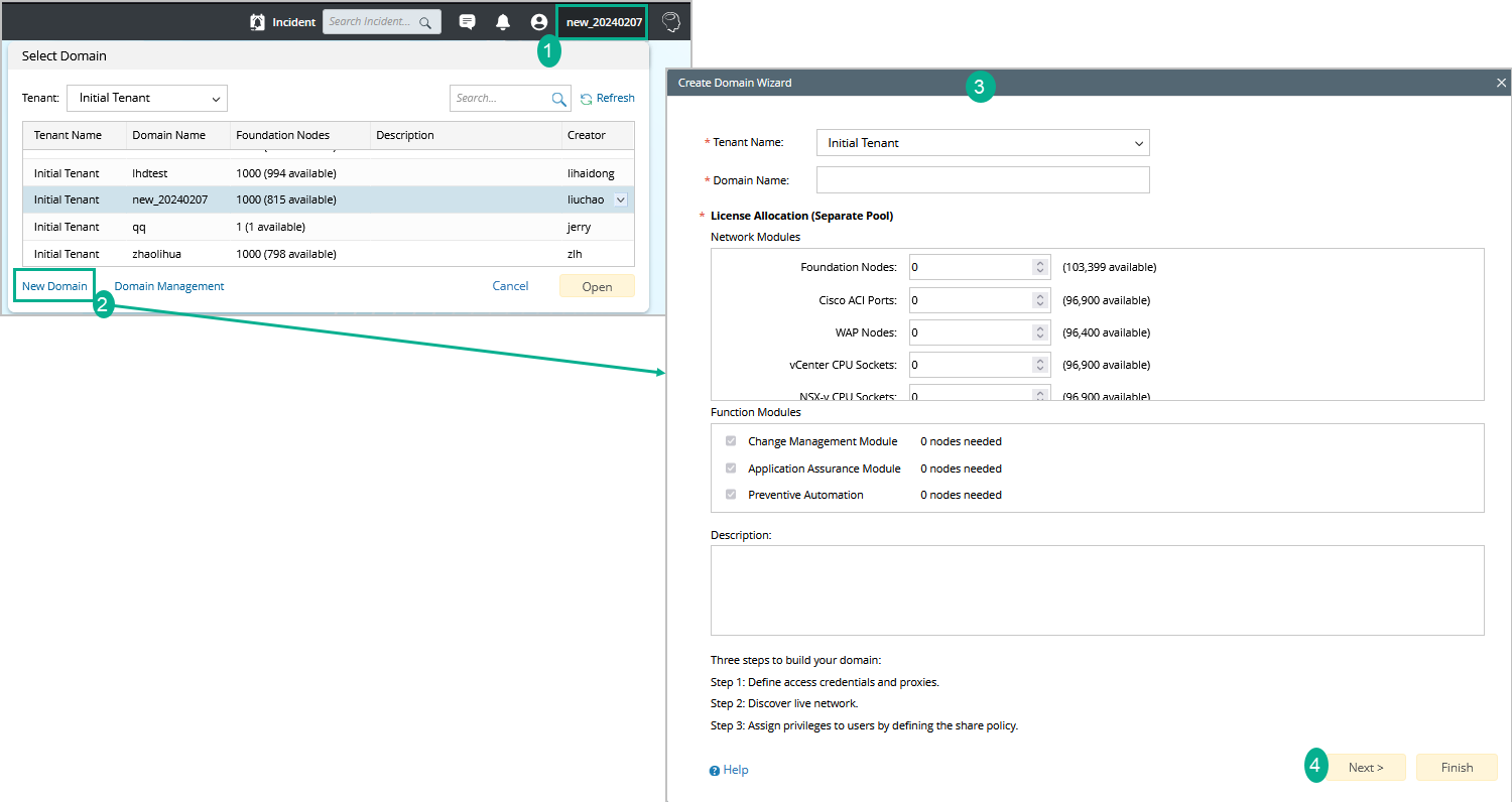 - Select the target tenant and click New Domain. The Create Domain Wizard is launched to guide you through the mandatory steps to create a domain.