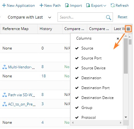 The Application Manager displays all the information about paths by default. To remove specific table headers, click the