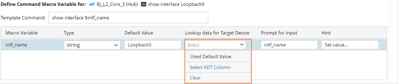 - Define Macro Variable: The device and the seed command with macro variables are displayed in the form of a table in the upper area of the Define Macro Variables and Rules for Their Substitution block. Select an entry from the table, then the UI for defining macro variable will display. Variable type, default value, lookup data, prompt for input, and hint can be defined here.