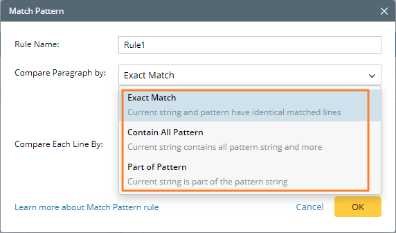 Click Learn more about... to see the match pattern rule, and then compare data with patterned text in baseline to know how to use the match pattern.