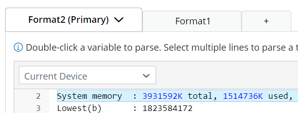 You can add more formats for the parser (click the + icon in the format tab bar). e.g., define the same variables for a Cisco IOS Switch device. The anchor is “System memory: total, used, free,” which is different from that in Format1.