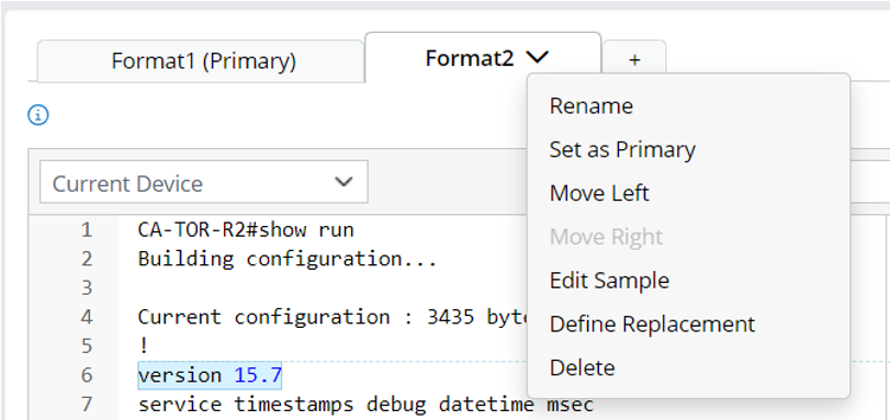 By default, a parser has one format, e.g., define total/used/free memory for a Cisco Router device. The anchor is “Processor Pool Total: Used: Free:”.