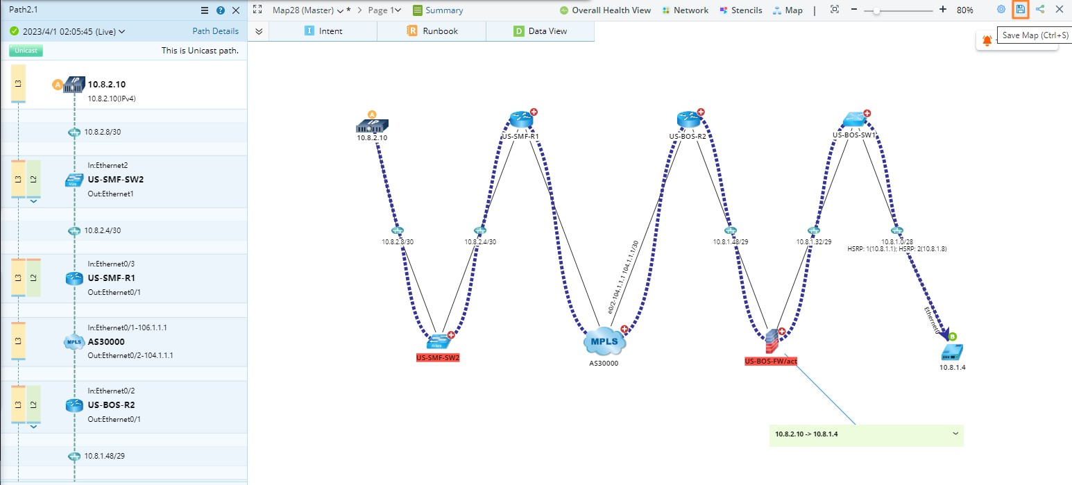 - View the created path intent from the Path intent drop-list, and after selecting a path intent, the intent details will be displayed in the Path Intent pane.