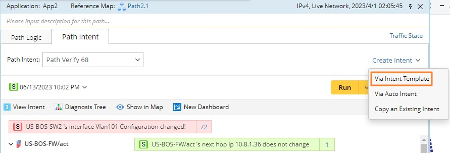 You can define an intent for a path, called the Path Intent. You can use Path Intent to document the baseline data and define the diagnosis logic for a path to achieve more efficient troubleshooting. Once network issues occur, the predefined path intent can be triggered to execute by the TAF (Trigger Automation Framework), Auto Intent or executed manually to diagnose the network problem. One path can have one or more associated path intents. The built-in path intent is directly stored in the path object.