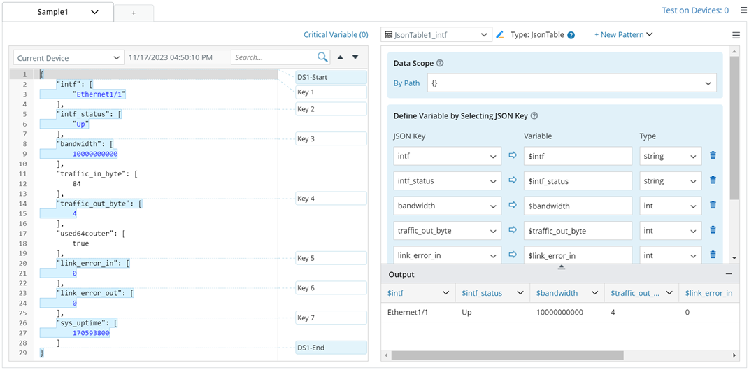 JSON Table parser is used to parse standard JSON-formatted text, such as Cisco ACI, AWS, and more. It requires certain coding know-how to use this type of parser. In the parsing process, the standard JSON text is parsed into a tree structure with nodes, and JSON paths (connection between the root node and the current node) are established. The parsed results in table form are generated based on path mapping (the path scope is defined by user) and the key mapping variables selected.