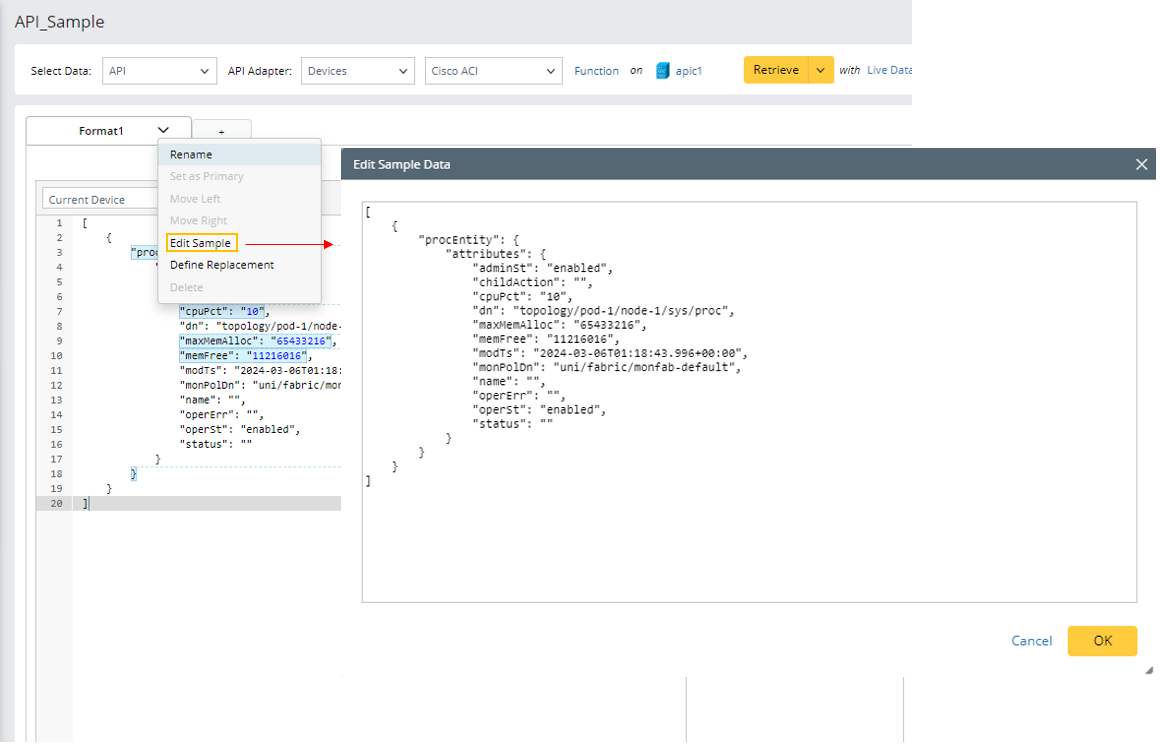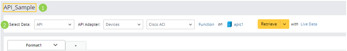 - Define the settings to retrieve API command data from the API adapter Cisco ACI on the device apic1.