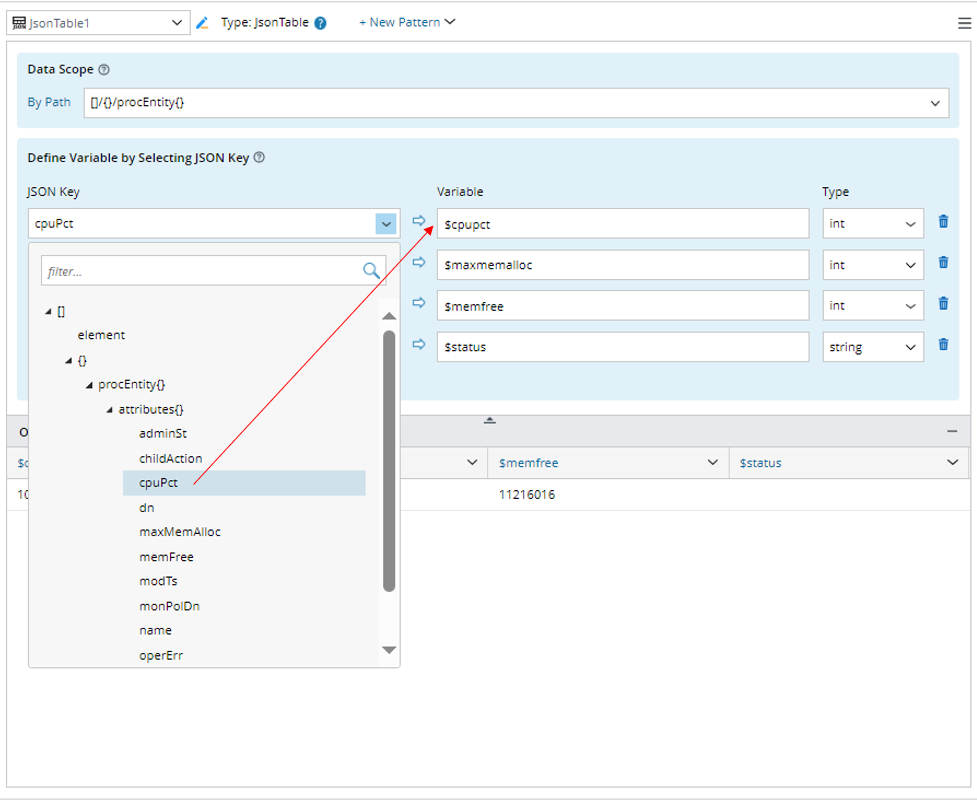 - After the input text is ready, you can continue to define the JSON table type in the right pane. Select Json Table from the + New Pattern menu to create a JSON Table type.