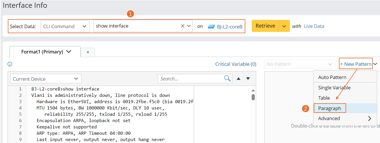 Take the parsing of interface information as an example. You can define a Paragraph Parser to parse interface information. Follow the instructions below to define a paragraph parser for parsing variables based on the CLI command data (show interface) collected on the device BJ-L2-Core-A.