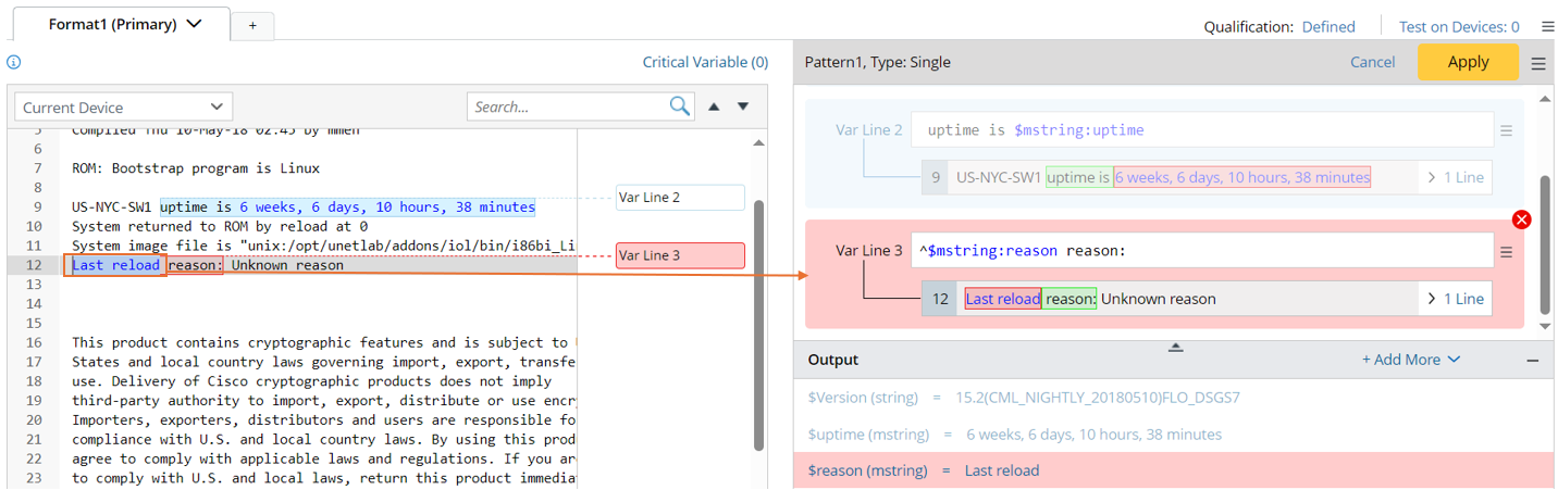 Tip: When you continue to add variable, the newly created line pattern will be in red background, indicating that it can be edited. While the previously created line patterns are disabled and cannot be edited. - In the Output area, click variable $reason in the Output pane to set variable name as $reload_type.