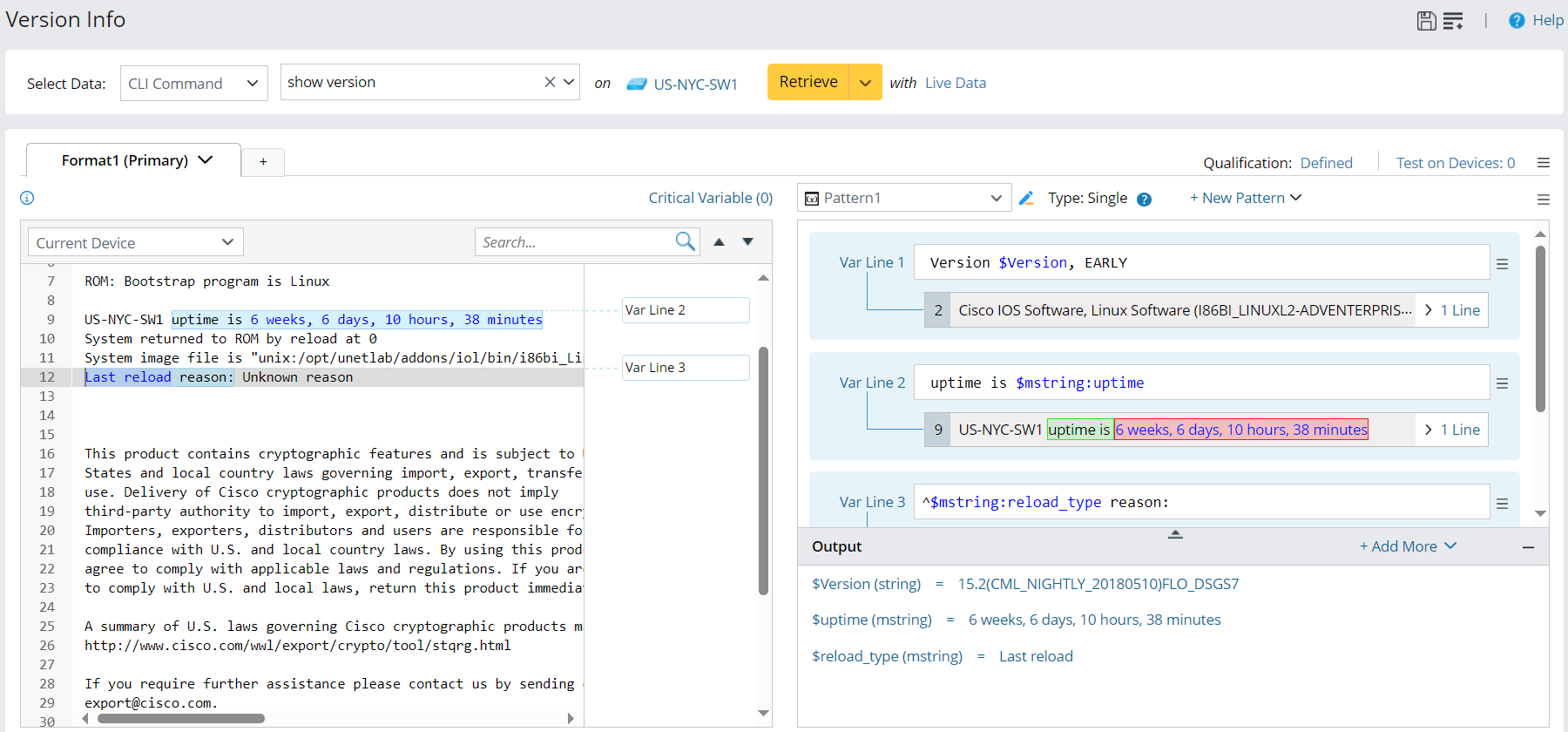 - Click the Apply button to create pattern, then check the output for the previous device version and the uptime.
