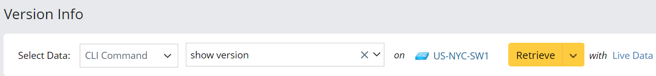 , then change the parser name from "Parser1" to "Version Info") and the definitions for retrieving CLI command data (set to retrieve CLI Command show version on the device US-NYC-SW1).