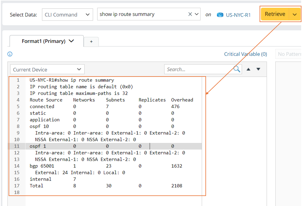 icon, then name the parser "IP Route Summary") and the definitions for collecting CLI command data. in this example, we will retrieve CLI command data of the command "show ip route summary" on the device US-NYC-R1.