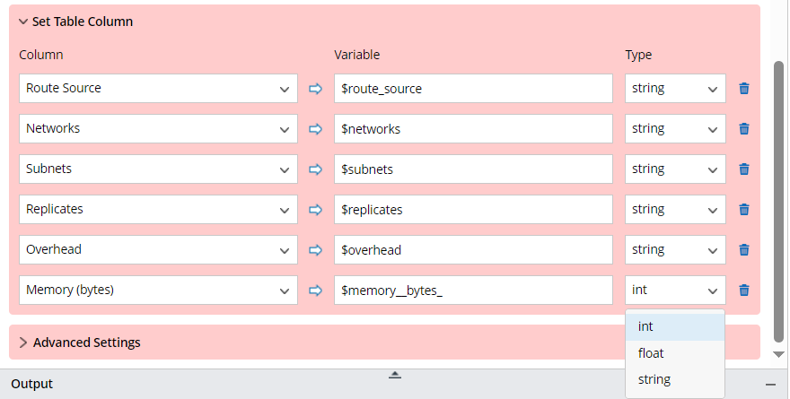 - In the Set Table Column block, select variables required to parse, rename the column and select the variable types. For example, you can change variable type of Memory (bytes) from "string" to "int".