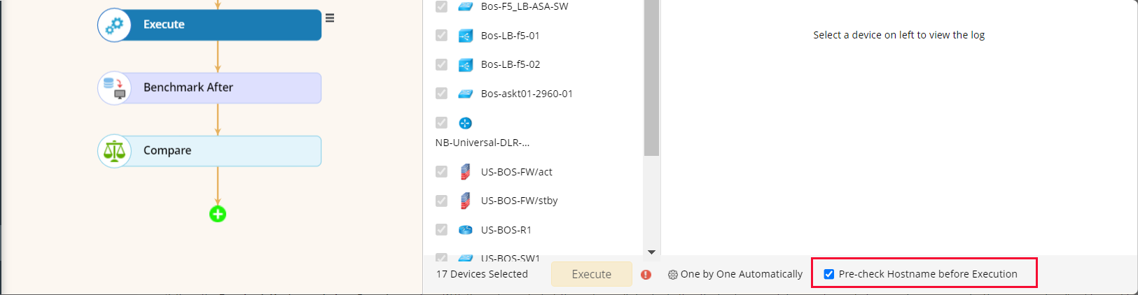 - Keep the Pre-check Hostname before Execution option. With this option selected, the system will check whether the hostnames of devices change before sending commands. The commands will not be sent to the devices with hostname changes.