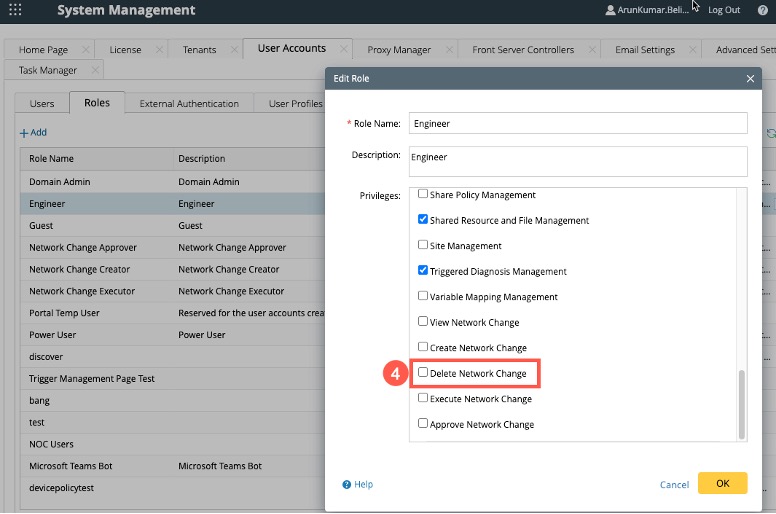 A window “Add Role” will pop up. Check the Delete Network change check box to enable the privilege.