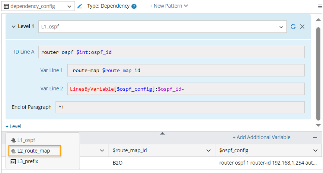 - Click + Level, then select the predefined pattern L2_route_map in this parser as Level 2.