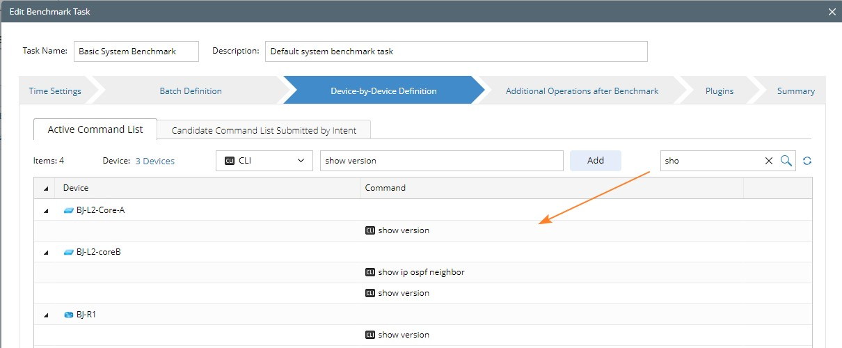 This tab allows you to manually add the device and command pair, and the command list of each device can be different based on the actual definition. Only CLI command and configuration are supported here.