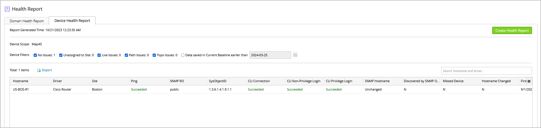 - Click Create Health Report to create report for the filtered devices.