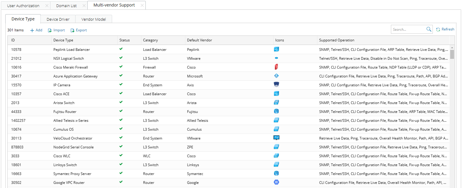 Tip: To browse the supported operations for a specific device type, you can double-click an entry. |