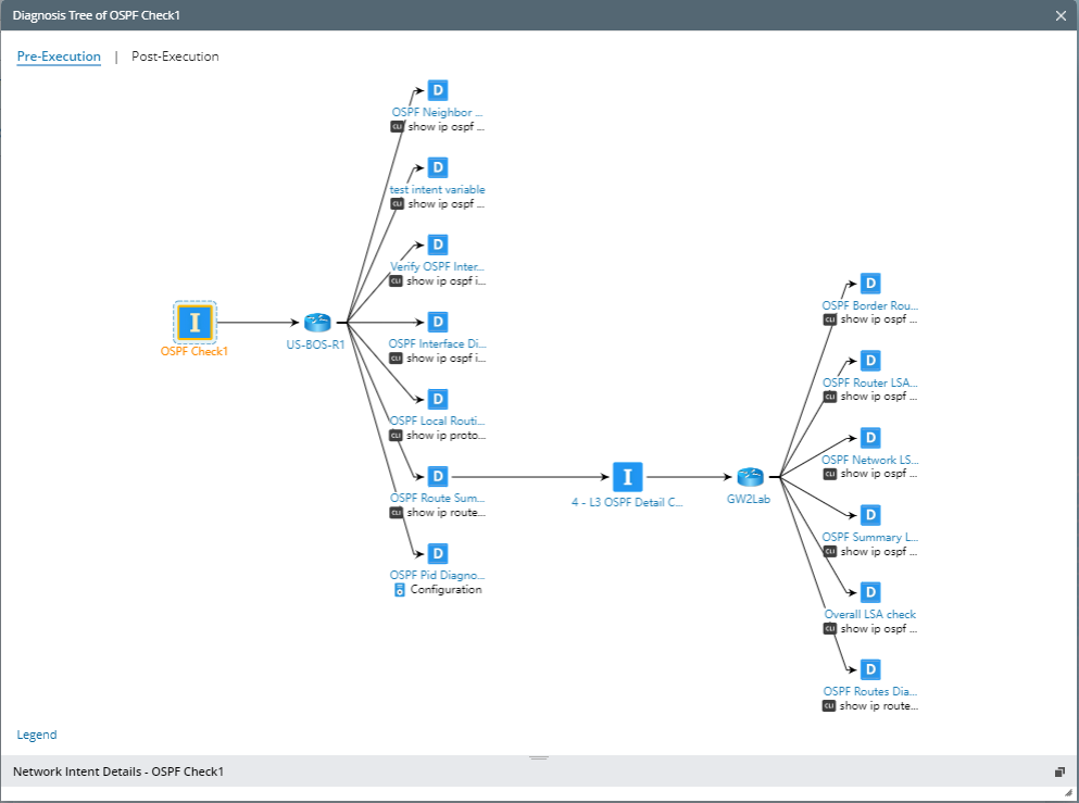 The diagnosis tree has two modes: Diagnosis Tree (Pre-Execution) and Diagnosis Tree (Post-Execution). The Pre-Execution mode is automatically generated according to the defined follow-up NI and the Post-Execution mode is not available before this intent is executed.