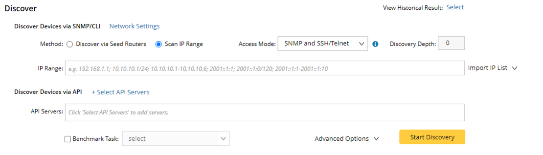 - SNMP and SSH/Telnet — retrieve vendor and model information via SNMP first, and then log in to devices by using SSH to retrieve live data; if SSH doesn't work, then use Telnet.