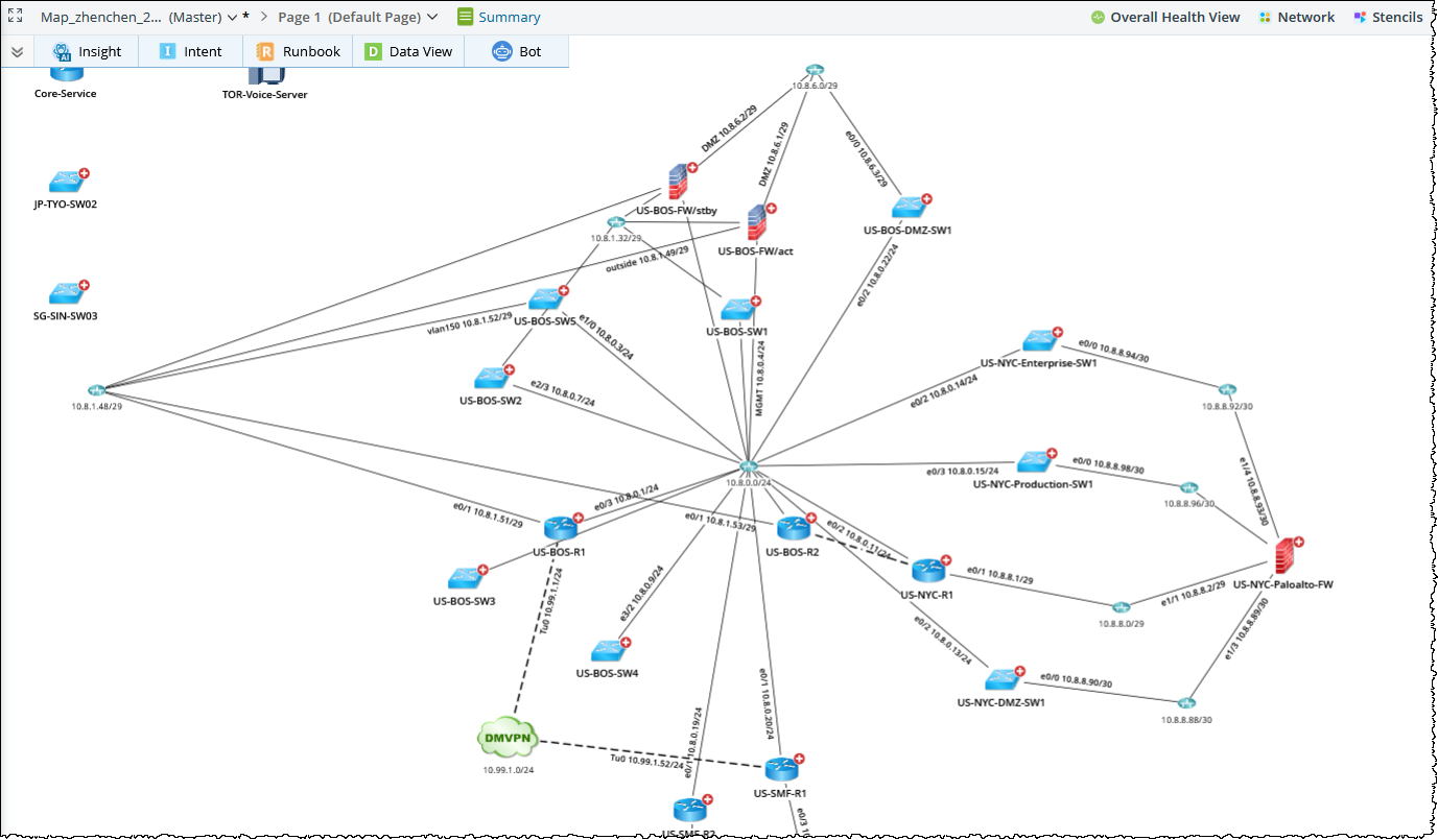 A sample map showing the traditional routers, switches, VPN and their connections: