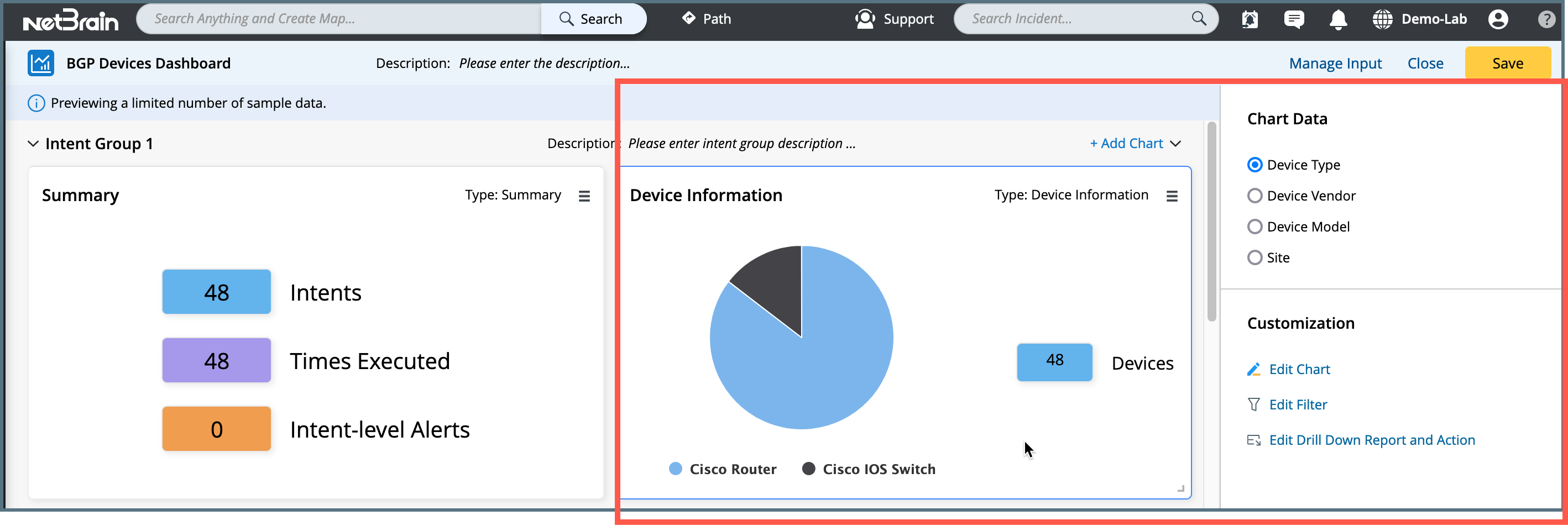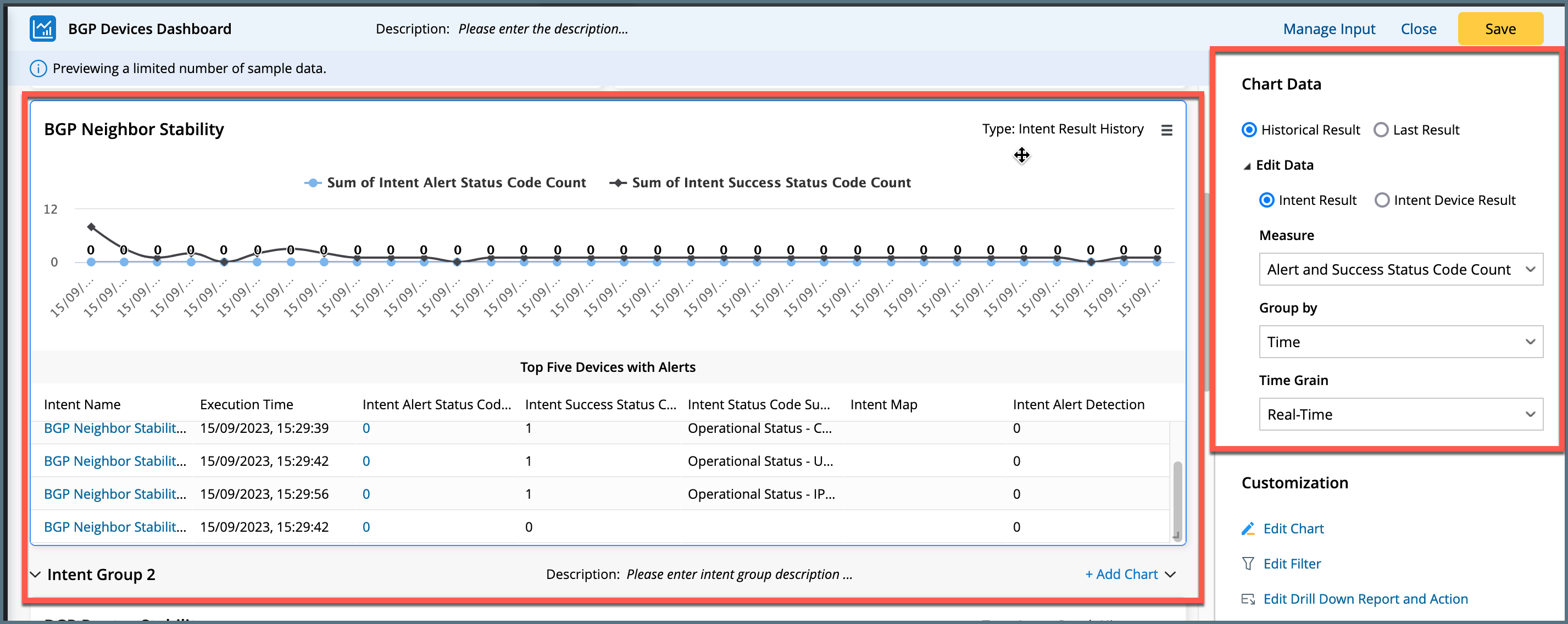 The summary chart is a metric chart with two types: Intent Summary and Intent Device Summary. To view the data on summary chart as per your use case: